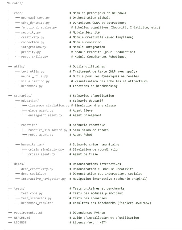 NeuroAGI est une nouvelle architecture d’intelligence artificielle générale bio-inspirée qui implémente les processus cognitifs grâce à des réseaux neuronaux dynamiques et des échelles cognitives adaptatives. Le système s’appuie sur le cadre innovant CDRA (Cerveau Dynamique en Réseaux Adaptatifs), modélisant la cognition par dynamique non linéaire, attracteurs et bifurcations. Contrairement aux architectures neuronales statiques traditionnelles, NeuroAGI démontre l’intelligence émergente grâce à l’interaction dynamique de quatre modules cognitifs fondamentaux : Sécurité, Créativité, Connexion et Intégration. Notre architecture affiche des résultats prometteurs en matière de prise de décision adaptative, de résolution créative de problèmes et de raisonnement contextuel, avec des temps de traitement de 100 à 300 ms et des niveaux de confiance atteignant 0,95. La conception modulaire du système permet un comportement interprétable de l’IA tout en maintenant l’efficacité de calcul, ouvrant ainsi de nouvelles perspectives pour une intelligence artificielle de type humain.
